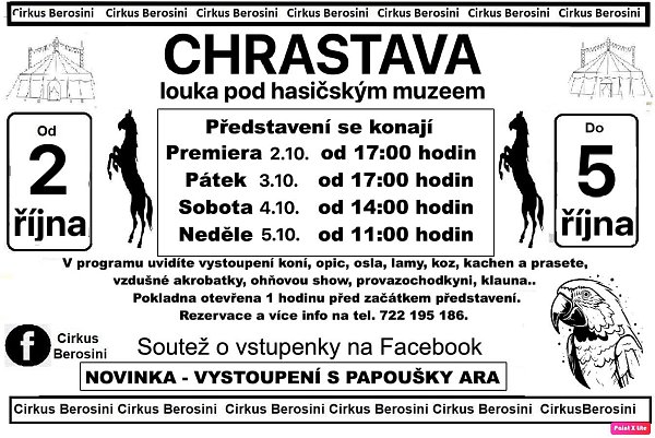 Cirkus Berosiny vystoupí v Chrastavě na louce pod hasičským muzeem ve dnech 2. 10 a 3. 10. od 17:00 hod., v sobotu 4. 10. od 14:00 hod. a v neděli 5. 10. od 11:00 hod.